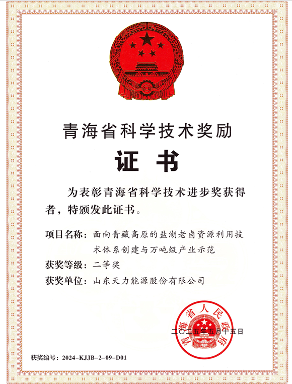 5月20日,2024年度青海省科学技术奖励大会在西宁召开,由山东天力能源股份有限公司(以下简称:天力能源)牵头完成的科技成果“面向青藏高原的盐湖老卤资源利用技术体系创建与万吨级产业示范”荣获2024年度青海省科技进步奖二等奖,这也是该公司荣获的第10项省级科技进步奖。