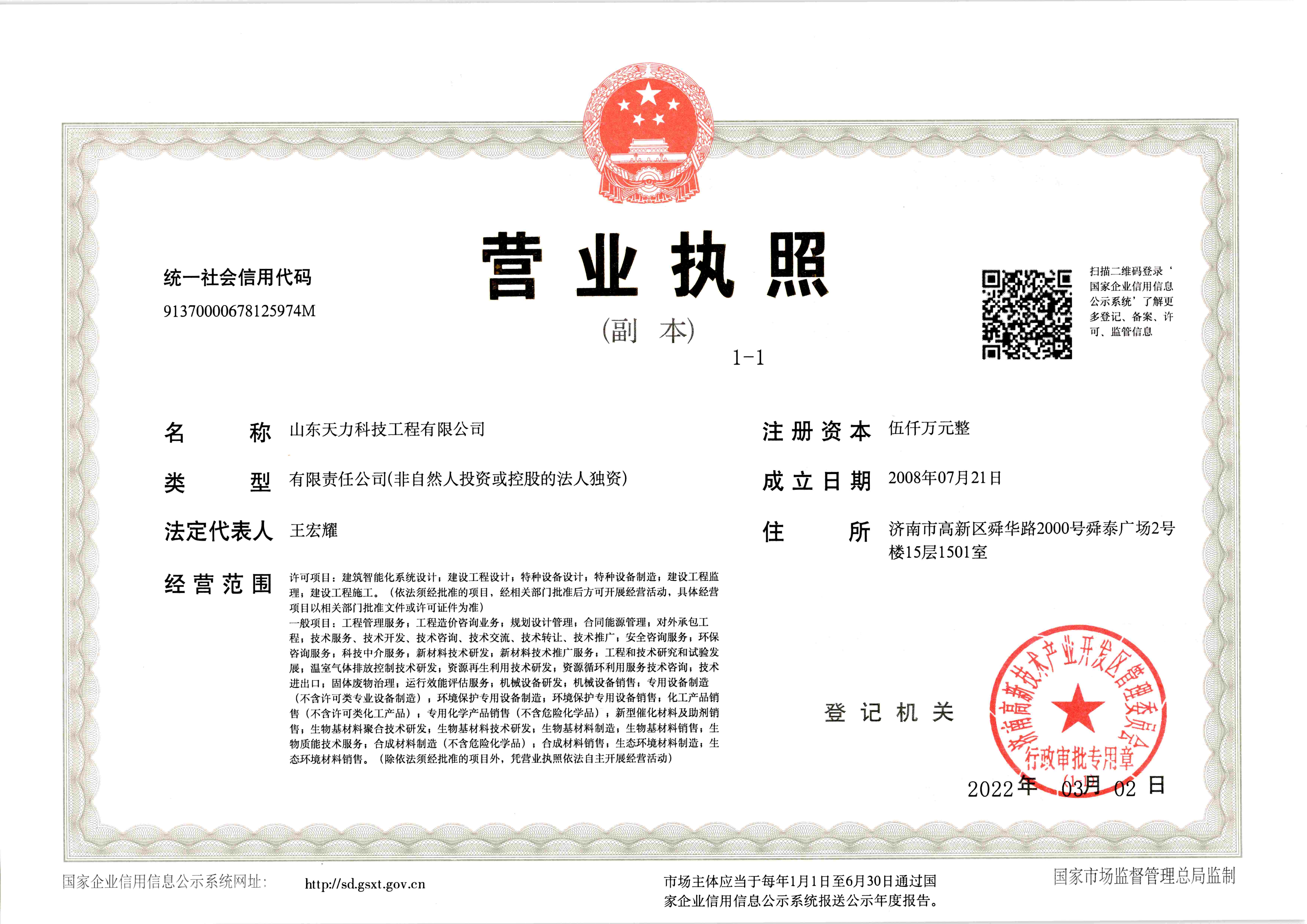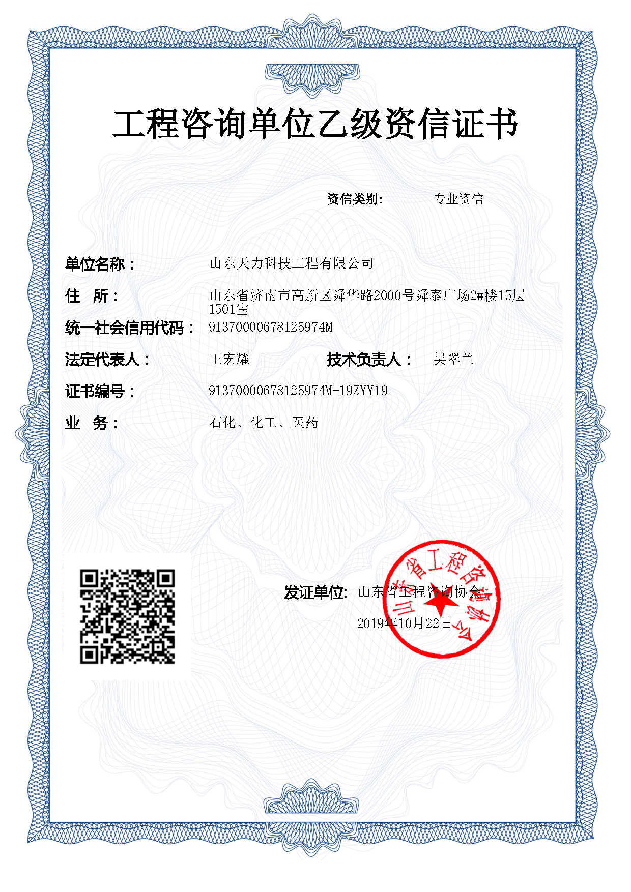 山东天力科技工程有限公司-工程设计资质证书-甲级正本